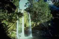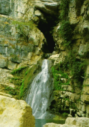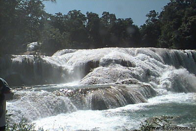 Nice thing about this place though, is that it is nicely centrally located for taking other day trips to see other places on the bus. About two hours away, Cascadas de Agua Azul is spectacular - the picture on the top of this page does not do it justice. The water there is an amazing color of blue if you go at the right time; if you go after some heavy rains, you will see "cascadas de agua cafe" instead. About one hour away in the same direction is Misol Ha, another beautiful waterfall, with a cave up on the side of the hill. When the water isn't too high, you can climb up into it, through a narrow passageway, into a large chamber that has another waterfall inside it.